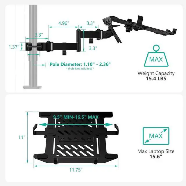 Universal Pole Laptop Mount: Fits poles with diameters ranging from 1.1" to 2.36", accommodating laptops between 10" and 15.6" while supporting up to 15.4 lbs. Support with mounting holes compatible with 75x75mm or 100x100mm for versatile installation options