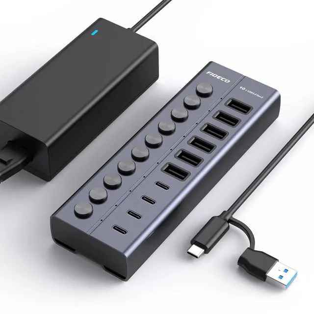 FIDECO 60W Powered USB Hub for Laptop and PC, 10-Port 10Gbps USB Splitter with 12V 5A Power Adapter, Aluminum USB 3.2 Gen 2 Multiport Adapter, 6 USB-A and 4 USB-C Ports, Support BC 1.2 Charging