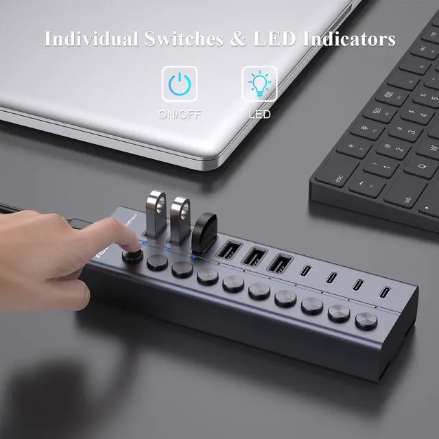 Independent On/Off SwitchThe specially designed switches can help control your device more easily without frequent plugging and unplugging in daily use. Our USB port hub