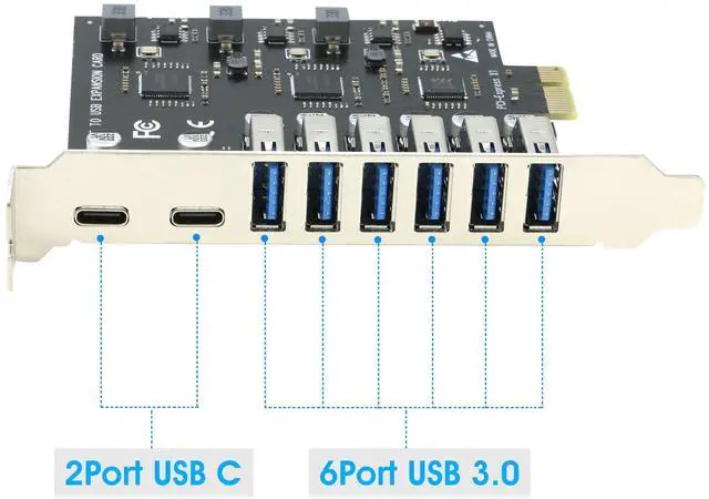 RIITOP USB 3.0 PCI-e Card provides 6x external USB 3.0 ports and 2xPort USB C via PCI-e x1/x4/x8/x16 for your PC, to connect external Hard Drives, CD/DVD drives, printers, scanners, webcams, and any other USB Devices