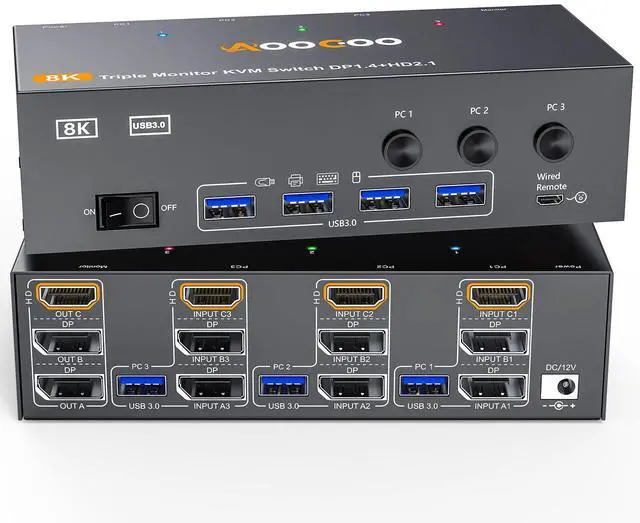 Triple Monitor KVM Switch2 Displayport1.4+HDMI2.1 USB3.0 KVM Switch allows 3 desktops to share 3 monitors and 4 USB3.0 ports(keyboard,mouse and other USB devices).It can make your work space tidy and efficient, also a premium choice for working from home.NOTE:Only when your computer supports 3 display or multi display, you can use this KVM to achieve 3 PC to share 3 monitors.
