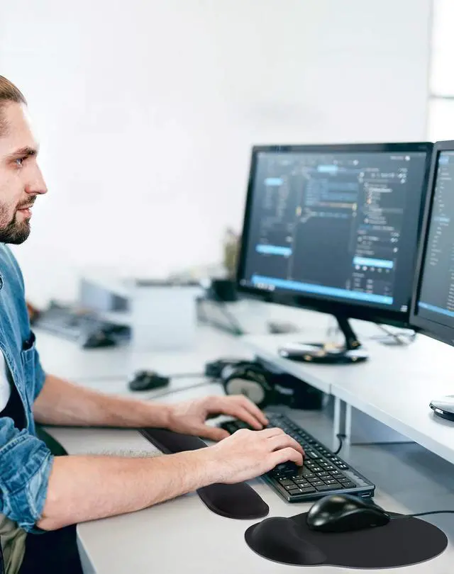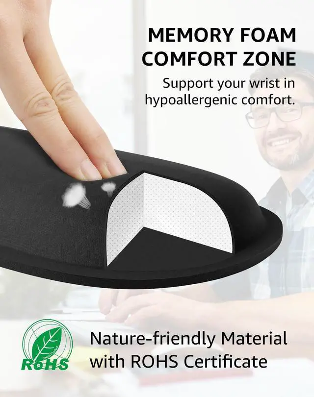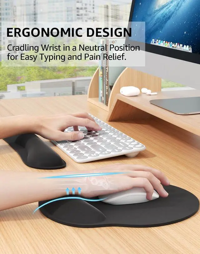 Ktrio 2-in-1 Wrist Rests, The ergonomic mouse pad wrist rest set is designed to promote wrist alignment with the keyboard and mouse, offering comfortable support that reduces pain and fatigue from extended repetitive tasks. Its memory foam cushioning ensures a neutral wrist position, minimizing pressure points that can lead to repetitive motion disorders. The non-slip rubber base keeps the pad securely in place for stable mouse and keyboard operation. With a convenient 2-in-1 design, it includes a 17.2 x 3.12 x 1 inch keyboard wrist rest and a 9.8 x 8.6 inchhe mouse pad with a 2-inch thick wrist rest, fitting various laptop and gaming keyboards.