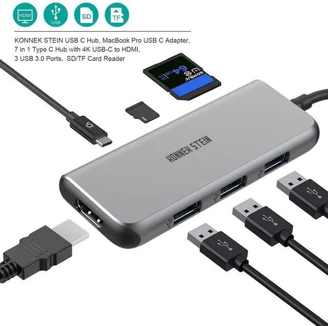 KONNEK STEIN USB C Hub, 7 in 1 USB C to 4k or 2K HDMI Port, SD Micro SD 2.0 Slot, 3 USB A Ports, Power Delivery Type C Charging Port, Docking Station MacBook Pro XPS More Type C Devices