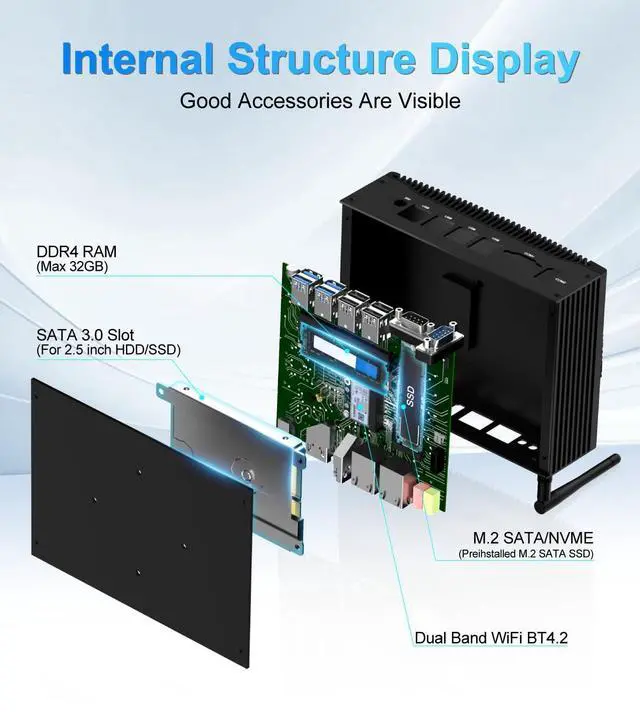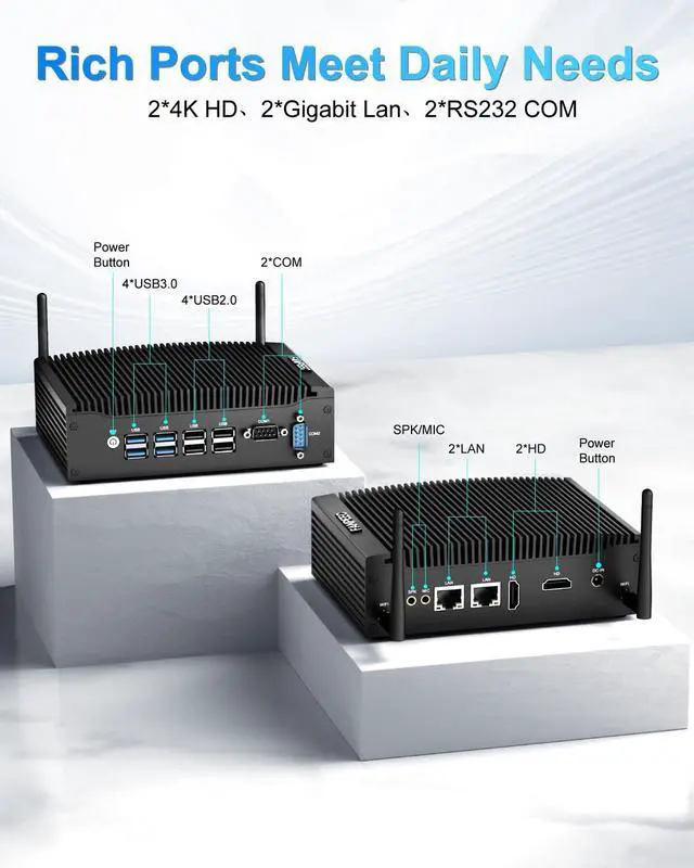 Flexible expansion, worry free massive storageMini pc industrial provides powerful hardware upgrade flexibility. Install DDR4 memory and equip dual storage interfaces: a high speed M.2 2280 SSD slot (supports up to 2TB capacity) and a 2.5 inch SATA 3.0 hard drive slot (supports up to 2TB capacity). You can easily combine large capacity hard drives and high speed solid state drives to balance storage space and system speed.