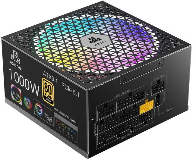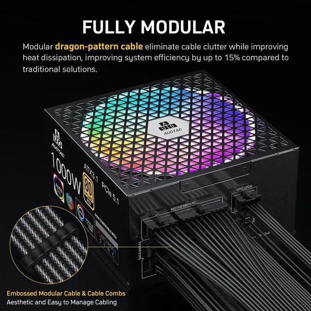 Auotac 1000W Fully Modular Power Supply 80+ Gold Certified with 12V-2x6 Cable ATX 3.1 & PCIe 5.1 Compliant, 140mm RGB Low-Noise Smart Fan, 105-Rated Capacitors, Black