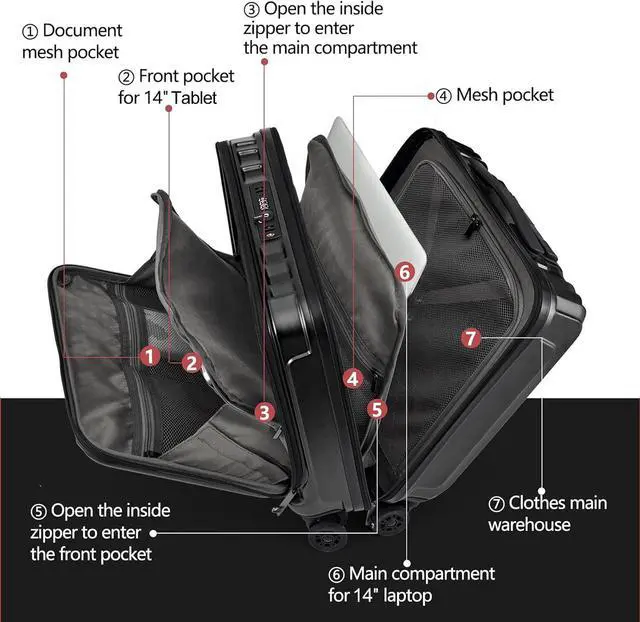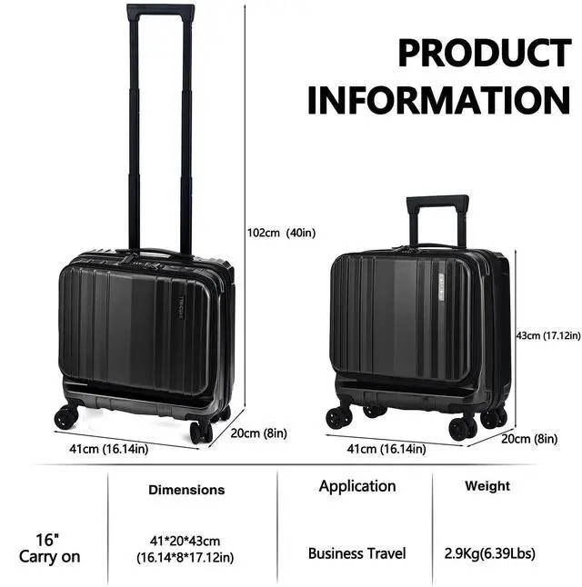 2 Laptop Compartments Design: With its divide front pocket designed to fit a 14" tablet and Main Compartment for 14" Laptop, you can easily access your electronics while on the go. Zippered mesh pockets for computer accessories, toiletries. 16 inch luggage measures 41*20*43cm(16.14*8*17.12in) including wheels, 2.9Kg(6.39Lbs), 39L capacity. Different airlines have different baggage allowances, please refer to the requirements of each airline for details.