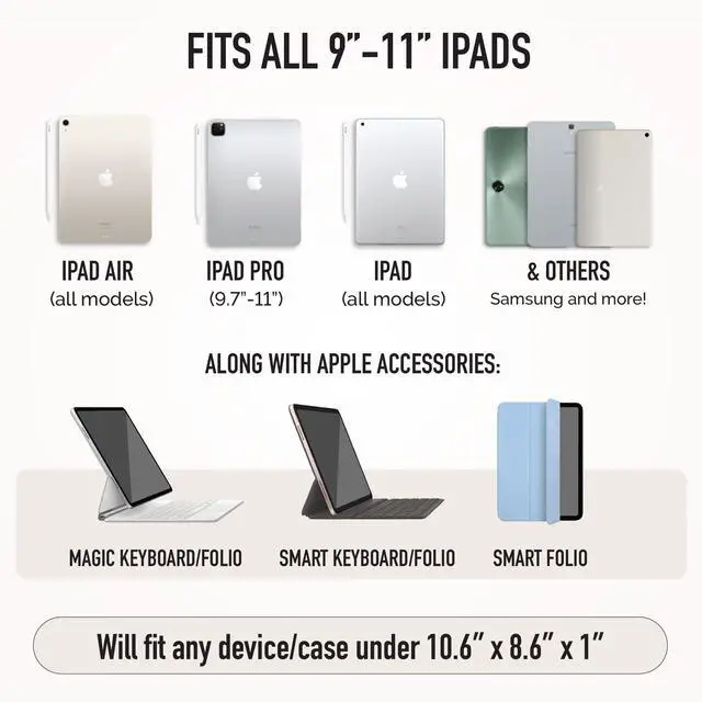 COMPATIBLE WITH ALL 9-11INCH IPADS: Including iPad Pro 11 Inch, iPad Air 6th Generation, 5th Generation, 4th Generation, 3rd iPad 10th Generation, 9, 8, 7, 6, 5, Samsung Galaxy Tab S8/A8/A7/S3 + more