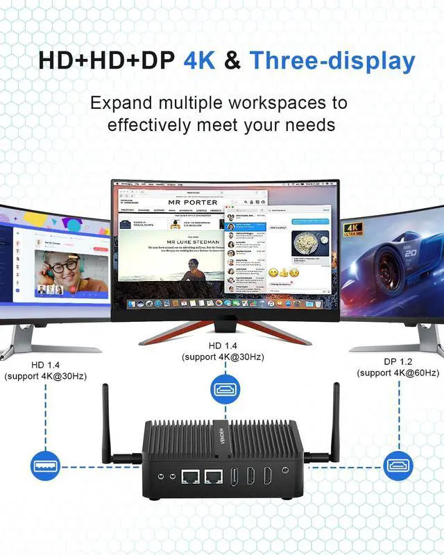 2* HD + DP 4K Triple Display: Fanless PC Win11 comes with 2 * HD (4K 30HZ) + 1 * DP (4K 60HZ) ports. supporting up to three independent monitors. T
