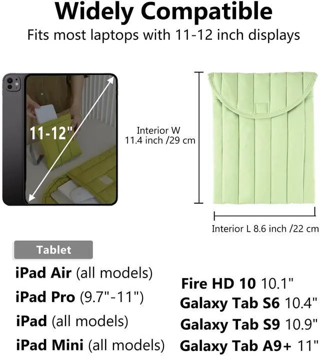 Wide Compatibility: 11-12 inch capacity, compatible with all 11-12 inch laptops. Compatible with 10.9-inch iPad 10th generation, iPad 10.2-inch 7th, 8th, 9th generation, 11-inch iPad Air M2, 11-inch iPad Pro M4, iPad mini 8.3-inch 6th generation