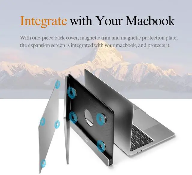 Fusion with Your Macbook Especially designed for your 13.6 inch mackbook, easily buckle JoyReal dual screen extender on your macbook, and even fix it with removable nano-adhesive, which integrates the dual monitor with your macbook.