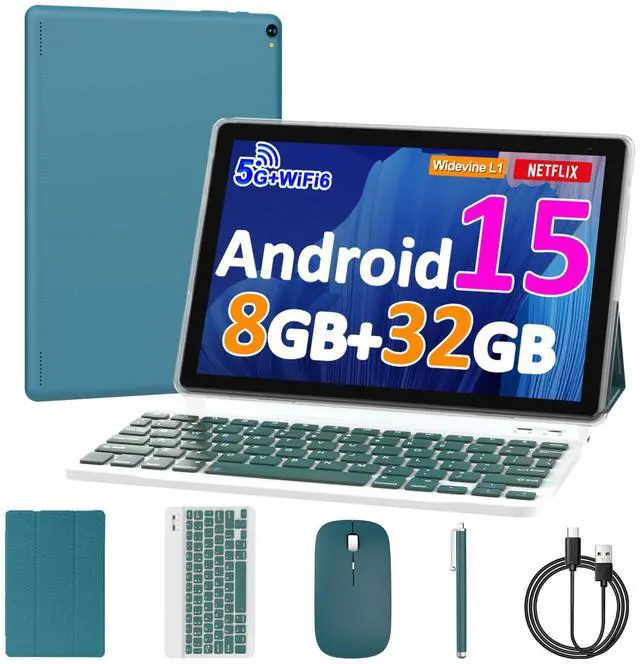 10 inch Android 15 Tablet, 8GB RAM 32GB ROM Powerful Quad-core CPU, 1280*800 Resolution Screen Tablet PC, 8MP Camera, 6000mAh Battery Computer, 2 in 1 Tablets with Keyboard, Case, Mouse, Stylus Laptop