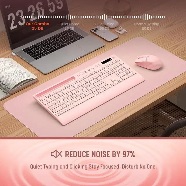 LESS NOISE, MORE FOCUS: Low-profile keys offer fluid, quiet typing. Silent experience in a wireless USB mouse. Get the same click feel with over 97% noise reduction, even the rubber scroll wheel glides silently