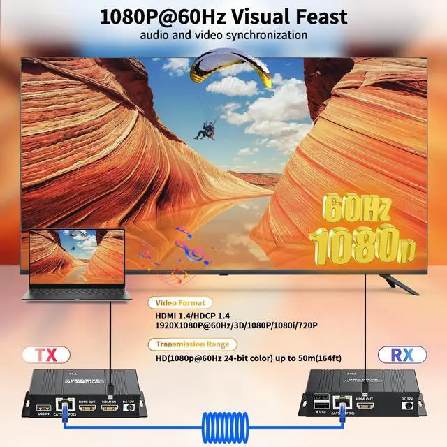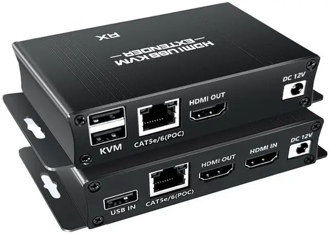 The 1080p USB HDMI KVM Extender enables you to place your workstation up to 60m away from a server a USB keyboard and a mouse console. This HDMI USB KVM extender extends HDMI& USB-based signals over a single CAT5E/6/7 cable. And with up to 1080p resolution, you get sharp, clear video, even on large monitors.
