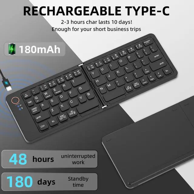 Mini Foldable Keyboard: A portable, foldable design comes with a complimentary phone stand, making it easy to work efficiently anytime, anywhere. Its standard keyboard layout ensures precise and rapid typing, rivaling the experience of a desktop keyboard. The silent design allows for enhanced focus, making it an ideal companion for travel and business activities