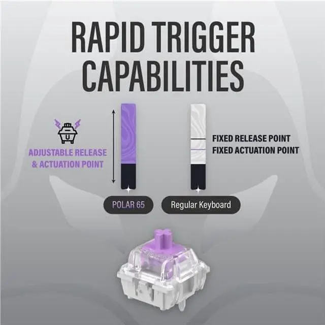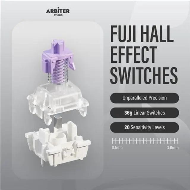 Elevate your gaming experience with the Arbiter Polar 65 - Magnetic Gaming Keyboard. This premium 65% compact keyboard features Fuji Hall Effect Magnetic Switches, offering 20 customizable sensitivity levels from 0.1 mm to 3.8 mm for precise and smooth control. The continuous rapid trigger with less than 1ms latency ensures ultra-fast inputs, ideal for competitive gamers. Crafted with a CNC aluminum frame, the Polar 65 combines elegance and durability, providing a stable foundation for intense gaming sessions. Customize your setup with 16 vibrant RGB lighting modes and personalized configurations via the webapp software.