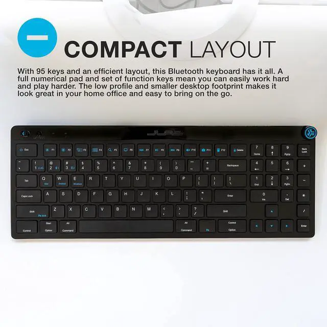 COMPACT LAYOUT With 95 keys and an efficient layout, this Bluetooth keyboard has it all. A full numerical pad and set of function keys mean you can easily work hard and play harder. The low profile and smaller desktop footprint makes it look great in your home office and easy to bring on the go.