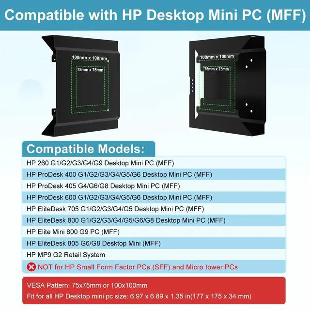 ---Compatibility---The mount for HP 260 G1/G2/G3/G4 Desktop Mini PC,HP Pro Mini 260 G9 Desktop PC, HP ProDesk 400 G1/G2/G3/G4/G5/G6 Desktop Mini PC, HP Pro Mini 400 G9 Desktop PC, HP ProDesk 405 G4/G6 Desktop Mini PC, HP ProDesk 600 G1/G2/G3/G4/G5/G6 Desktop Mini PC, HP Elite Mini 600 G9 PC, HP EliteDesk 705 G1/G2/G3/G4/G5 Desktop Mini PC, HP EliteDesk 800 G1/G2/G3/G4/G5/G6/G8 Desktop Mini PC, HP Elite Mini 800 G9 PC, HP EliteDesk 805 G6/G8 Desktop Mini, HP MP9 G2 Retail System