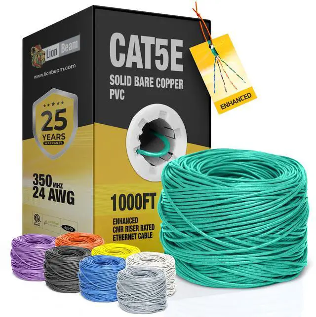 Premium Cat5e Ethernet Cable: The Lion Beam High-Performance Cat5e Ethernet Cable comes in a 1000ft pull box. It uses high-quality pure solid bare copper wires, protected with durable insulation and a strong PVC CMR riser-rated jacket. With a speed of 350 MHz, it supports fast connections and power over Ethernet (PoE/PoE+/PoE++), handling heavy network traffic with speeds up to 5 Gbps without interruptions.