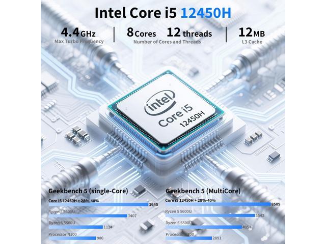 - Intel Core i5-12450H Mini PCThis mini computer is equipped with an Intel Core i5-12450H processor, Intel UHD Graphics 1.20 GHz, 8 cores and 12 threads, a 45W thermal design power consumption, and a core turbo frequency of up to 4.4GHz. Pre-installed with Windows 11 Pro and Linux-compatible, it's perfect for gaming, media editing, and office use.
