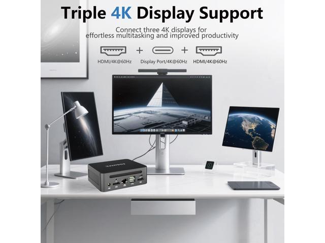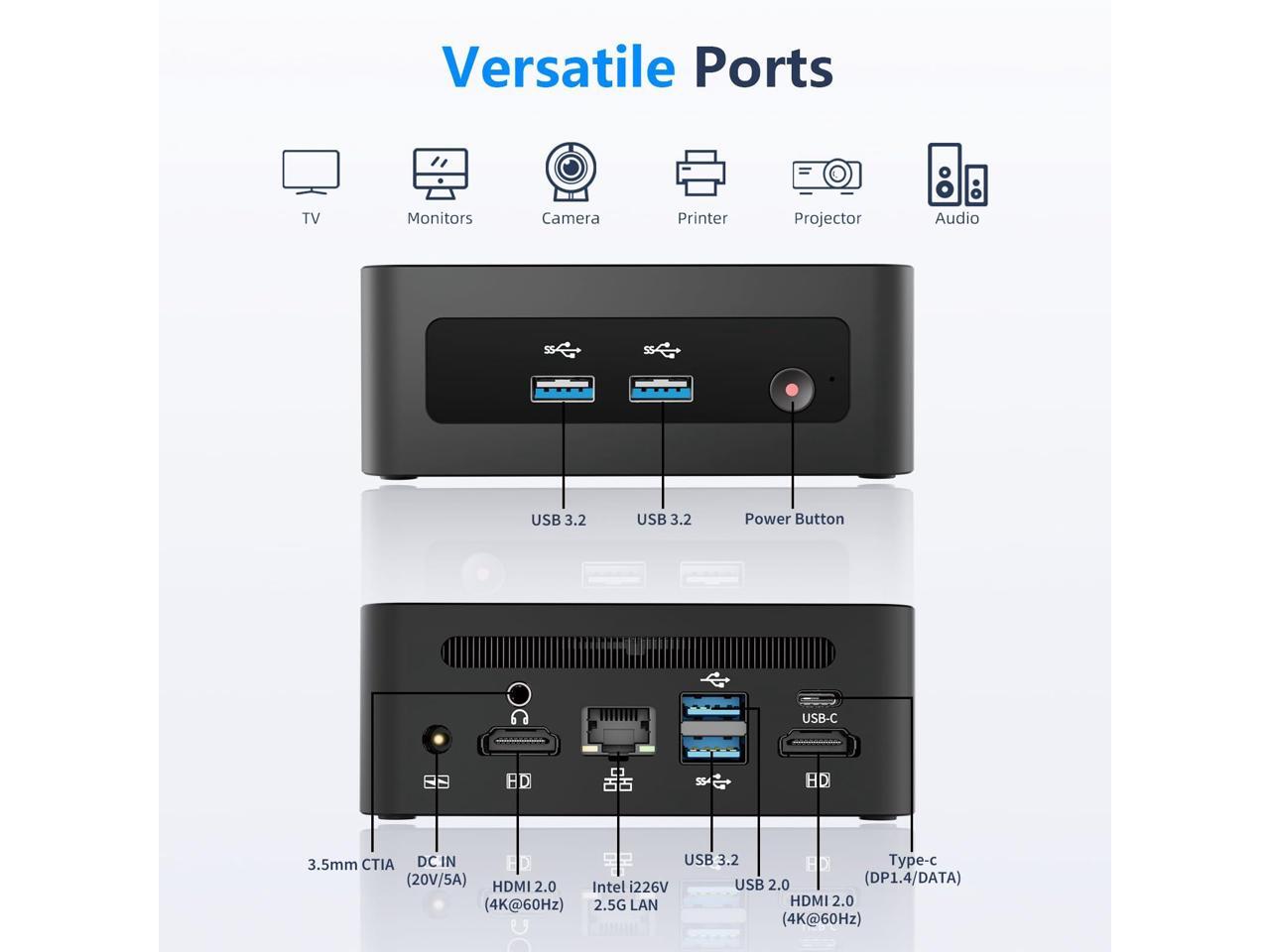 - Compact Design with Versatile ConnectivityThe mini desktop computer comes with 2 x HDMI 2.0 (4K@60Hz), 3 x USB 3.2, 1 x USB 2.0, 1 x DC Port, 1 x Type-C (Power/Data), 1 x LAN Port, and 1 x Audio-in/out Jack port.The size of this sm
