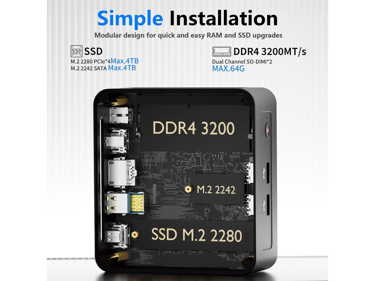 - 16GB DDR4 RAM & 512GB StorageThe micro PC comes with dual 16GB DDR4 RAM, expandable up to 64GB, ensuring seamless performance for demanding tasks.With a 512GB M.2 PCIe 2280 SSD, it offers generous storage that can be expanded up to 4TB. Plus, the small PC supports an additional M.2 SATA 2242 drive, with expansion up to 4TB, providing enhanced flexibility for handling data-intensive applications.