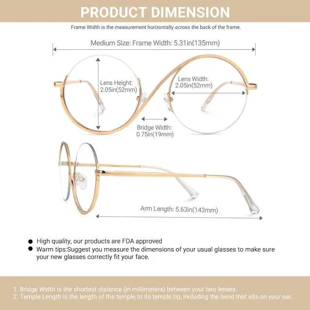 • Medium size -- Lens Width:2.05" (52mm) , Lens Height:2.05" (52mm) , Bridge Width:0.75" (19mm) , Frame Width:5.31" (135mm) , Arm Length:5.63" (143mm)