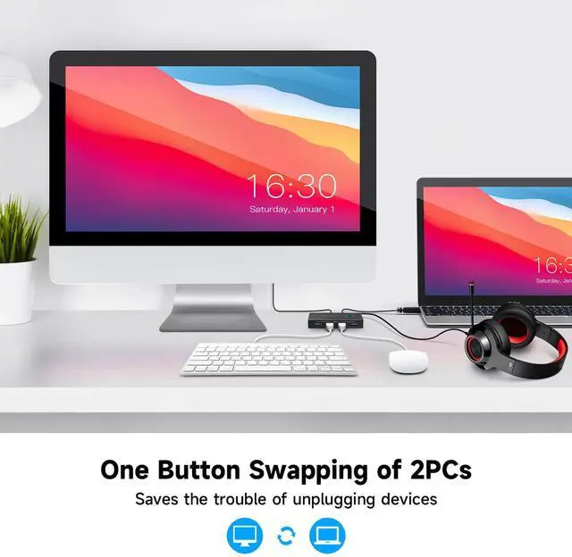 Simple & Sturdy Design: One-Botton Switch & LED Light Indicator. Easily switch between 2 computers with the click of a button, LED light colors (blue and red) indicate the active computer. The USB 3 switch adopts aluminum s