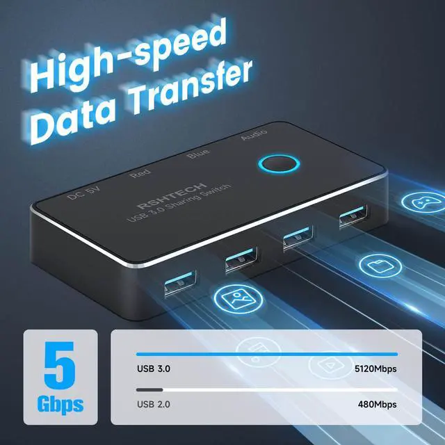 2 In 5 Out USB Switch Selector: RSHTECH USB 3.0 sharing switch allows one-button toggle between 2 computers to share 4 USB devices and 1 audio device, such as printer, scanner, mouse, keyboard, USB drive, wired headset, headphone, etc. Plug and play, No driver required
