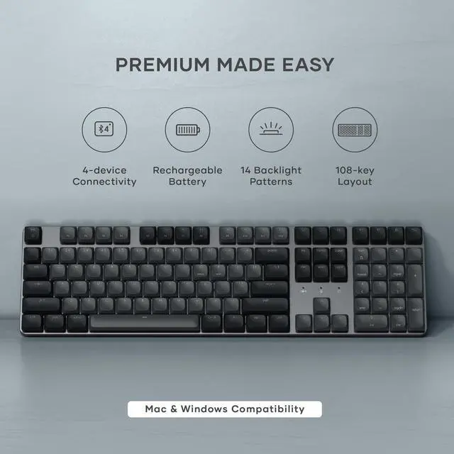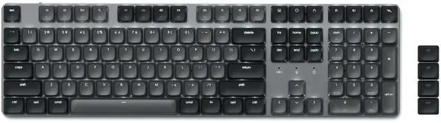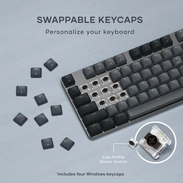 108 Keys Low Profile Keyboard The Satechi full size mechanical keyboard features low-profile brown switches, providing unmatched tactile feedback and faster actuation, and removable keycaps that make it easy to clean and customize your keyboard. Designed to strike the perfect balance between typing and gaming, the keyboards quieter operation is ideal for office environments or shared spaces