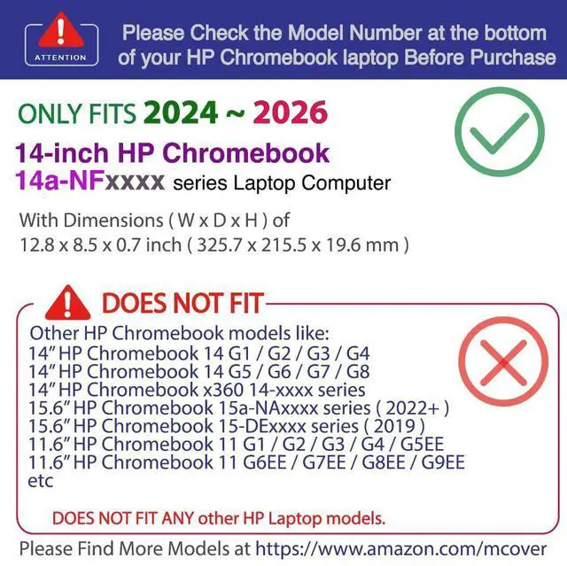 Designed to perfectly fit the 2024 or later 14-inch HP Chromebook 14a-NFxxxx series laptop computer with dimension( Width x Depth x Height ) of 12.8 x 8.5 x 0.7 inch ( 325.7 x 215.5 x 19.6 mm )