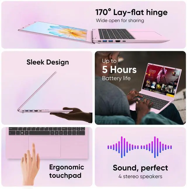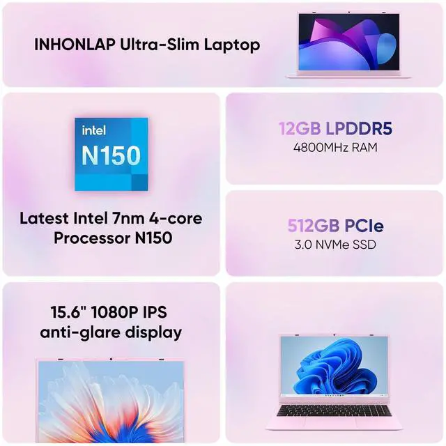 INHONLAP Pink Laptop, N150 Processor, Up to 3.6 GHz, 12GB RAM 512B SSD, 15.6 Inch FHD IPS Display Laptop Computer, WiFi 6, BT 5.2, Webcam, USB-C, Long Lasting Battery