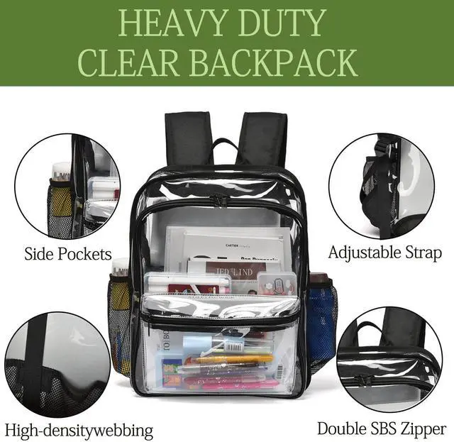Heavy Duty Clear Backpack - The large clear backpack is made of transparent 0.6 mm PVC material is anti-tear, water resistant, soft and odorless its load bearing up to 65lbs. Also clear book bag has out standing performance in hot and cold weather ( 50 to -40 )