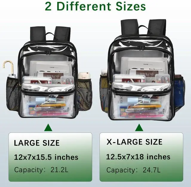 Large Capacity Clear Bookbag - Clear backpack stadium approved size is 12.5x7x18 inche (L x W x H). Clear back pack feature 2 main double SBS zipper compartment to put heavy items such as books, 15 inch laptop. 1 front pockets you to hold phone, cash,cards, 2 side mesh pockets to hold cup or umbrella
