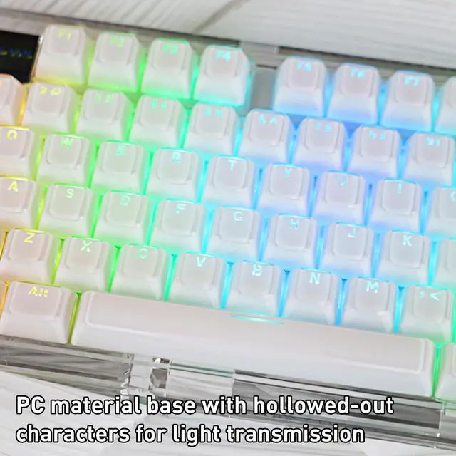 Transparent keycapsSmooth appearance and cool touch, This keycap has a transparent layer on the outside and a white layer on the inside, which has a kind of frozen feeling; that upgrade your basic RGB keyboard illumination to another more dazzling and fancy outlook level.