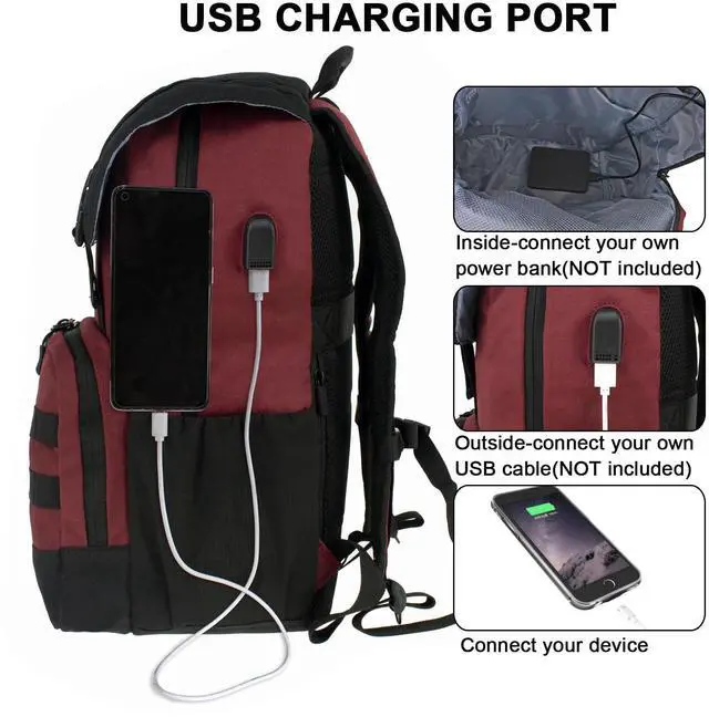 USB Charging Port: The laptop backpack features an external USB charging port, allowing you to connect a power bank (not included) and charge your electronic devices conveniently