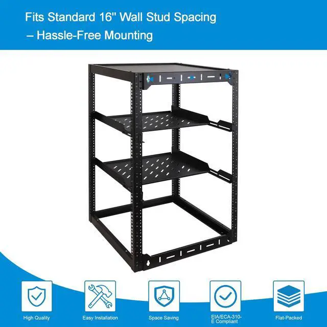 Maximize your network setup with the RackPath Open Frame Server Rack a versatile and durable solution for organizing your IT, AV, or telecom equipment. Built with premium cold-rolled steel and finished with a sleek black powder coating, this open frame rack offers both wall-mounted and floor-standing installation, adapting seamlessly to home labs, server rooms, or office closets. The included accessories 2× 1U vented shelves, a full set of 10-32 screws plus wall mounting screws ensure you're ready to mount switches, patch panels, modems, DVRs, or routers right out of the box.