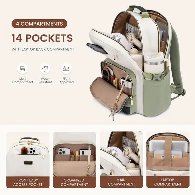 LOVEVOOK Laptop Backpack for Women with Pouch Pocket for Large Capacity Cup,15.6 Inch Laptop Computer Bag Travel Backpack Purse,Waterproof Work College Teacher Bags,White-Bean Green-Dark Olive Green