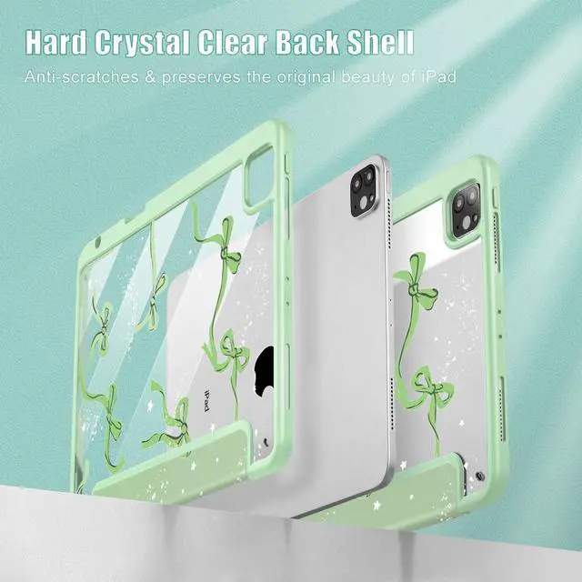 Tuiklol Case for iPad Pro 12.9 Inch M2 Case 2022 2021 2020 2018 Generation 6th/5th/4th/3rd,Built-in Pencil 2nd Holder Clear Transparent Protective Back Shell Cover, Bow-Green