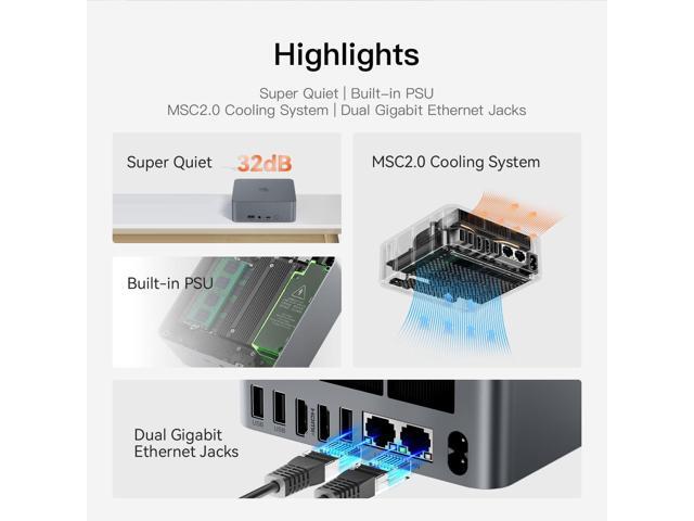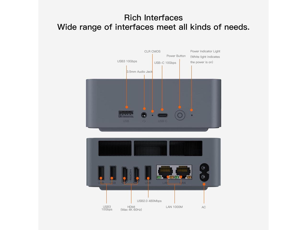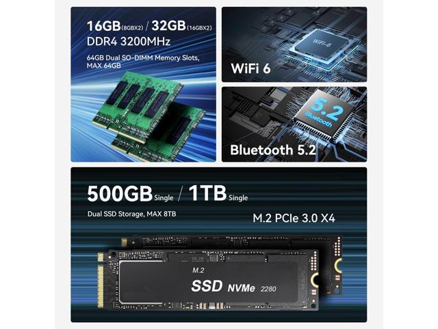 - High Capacity & Expansion OptionsThe mini computer is powered with 16GB DDR4-3200MHz RAM (can be upgraded up to 64GB MAX with 2 available memory slots).Installed with 500GB M.2 PCIe 3.0x4 2280 SSD and support dual-channel up to max 8TB(not included).Large capacity enables you to switch back and forth between more applications and save more favorite documents or movies.