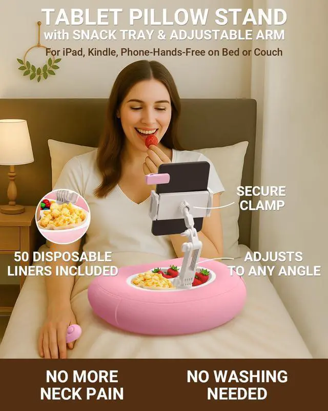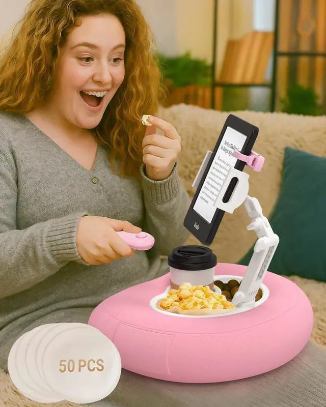 Bongogoo Kindle Pillow Stand with Remote Page Turner Bundle, Kindle Holder & Stand for Bed, 6 mm No-Text-Blocking Clip, Whisper-Quiet, Washable Cover, 2 Snack Bowls + 50 Liners, Fits 410.5