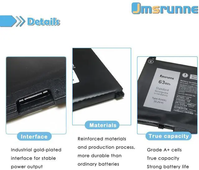 DELL RJ40GS pecifications Model: RJ40G./ Voltage: 15.2V ./ Capacity: 63Wh /Battery type: Li-ion. /Battery life: Up to 1000 recharge cycles over the life of the battery. Also comes with installation tools.Purchasing Note: Due to the complexity of laptop battery models, you may not be able to accurately determine the model you need to purchase,Please open the back cover of the laptop to confirm the original battery model number