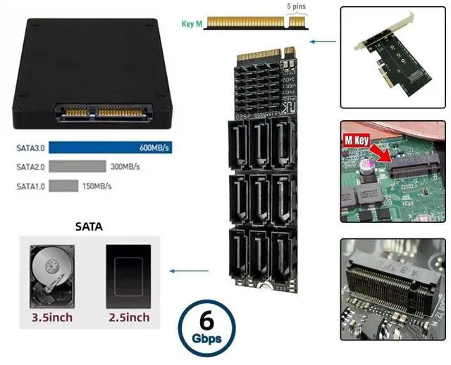 1) NVMe to 9 SATA Adapter is designed for less SATA Ports but more spare M. 2 NVMe Slots on Motherboard, This M. 2 SATA Adapter will help you expand 9x regular SATA ports for storage appliances that use many SSDs and/or 3.5" hard drives.