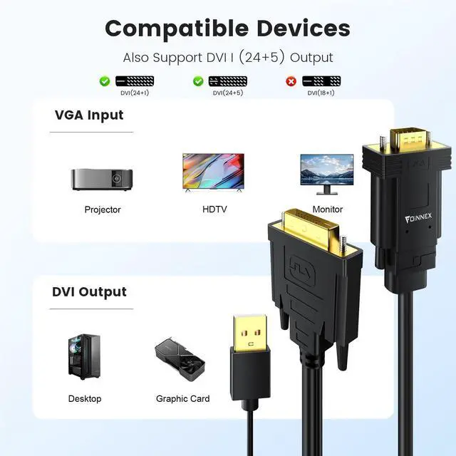 Plug and Play Foinnex DVI cable for VGA screen is easily installed, plug and play with no external driver required, quick connection. Note: not VGA to DVI adapter.