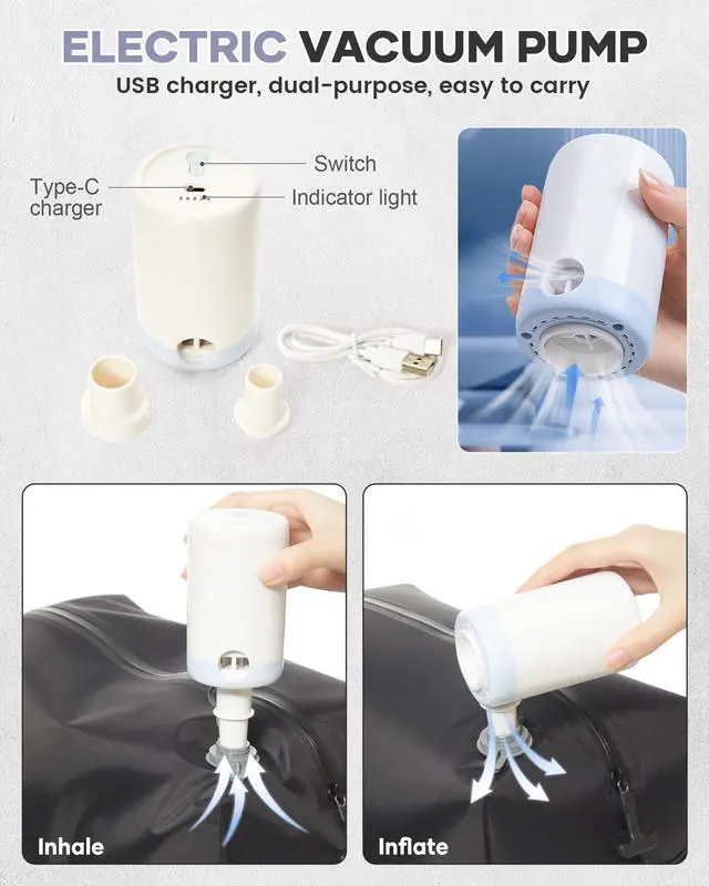 Portable Vacuum Pump - Comes with a compact vacuum pump for on-the-go convenience. Multiple nozzle attachments allow precise air extraction, whether you're quickly compressing clothes or adjusting storage space.