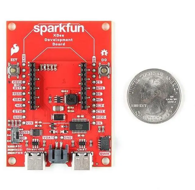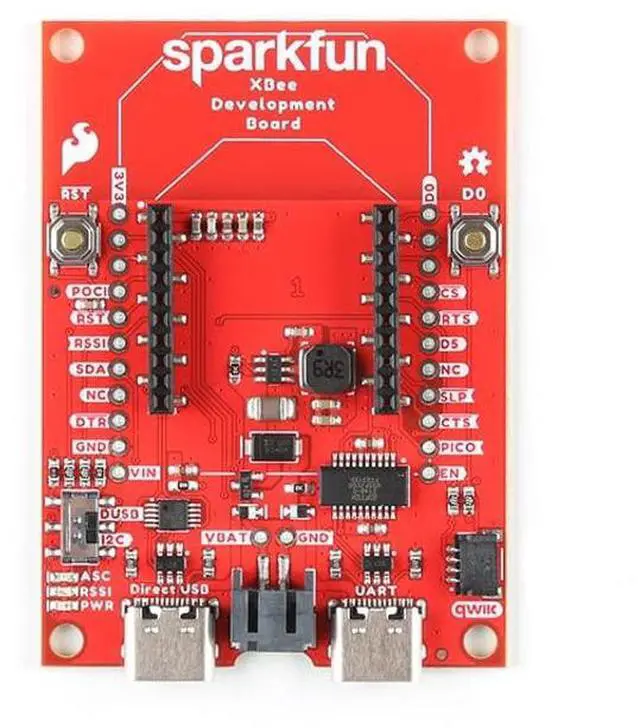The SparkFun Digi XBee Development Board is designed to help you quickly and easily prototype low-power cellular IoT applications using the new Digi XBee 3 Low-Power LTE-M/NB-IoT, Digi XBee RR, and any existing through-hole Digi Xbee module. This board breaks out all the functionality of your XBee module and adds the ability to connect to the cellular network and (drumroll, please) GNSS. This is a "kitchen sink" development board that gives you access to the pin functionality of the XBee, includes two USB-C connectors for UART communication and firmware updates, a Qwiic connector for I2C capable sensors and peripherals, as well as Reset and D0 buttons and the ability to update firmware on the XBees that have cellular modules.
