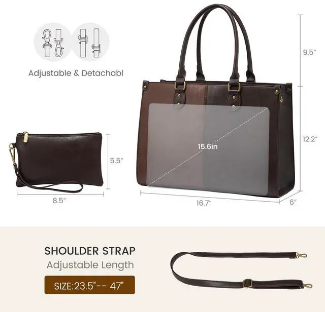 What You Will Get: 1 x 15.6 -inch laptop tote bag 1 x Small, charming clutch purse 1 x Detachable, adjustable shoulder strap