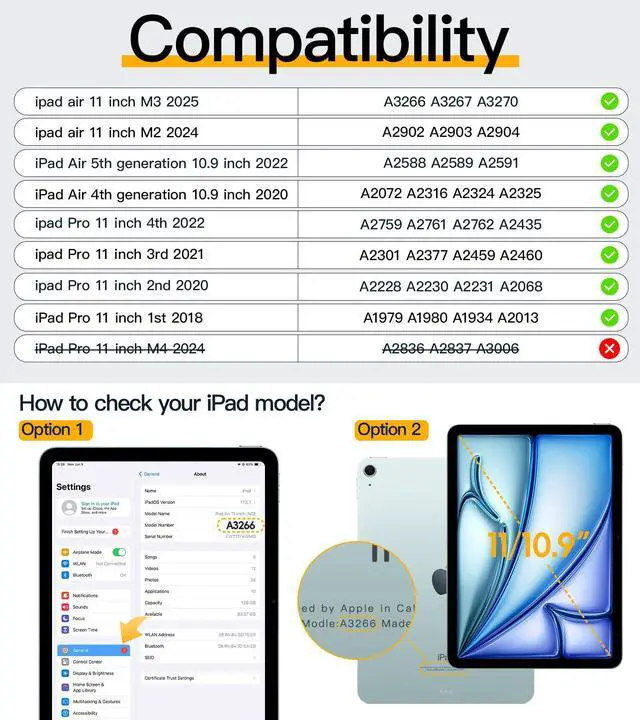 [Compatible]:This heavy Duty protective case case is NOT Compatible with iPad Pro 11 (M4) 2024. Only Compatible with iPad Air 11" M3 2025(A3266/A3267/A3270),iPad Air 11" M2 2024(A2902/A2903/A2904), Air 5th 10.9" 2022(A2588/A2589/A2591),Air 4th 10.9" 2020(A2072/A2316/A2324/A2325), Pro 11"4th 2022(A2759/A2435/A2761/A2762),Pro 11"3rd 2021(A2377/A2459/A2301/A2460),Pro 11" 2nd 2020(A2228/A2068/A2230/A2231),Pro 11" 1st 2018(A1980/A2013/A1934/A1979). Please check the model of iPad before purchasing.