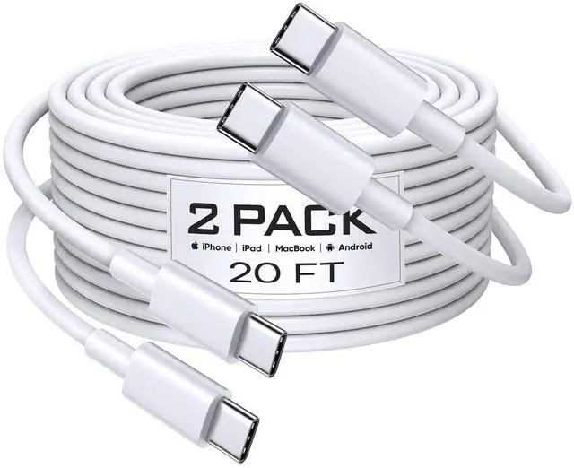 2Pack USB C to USB C Cable 20FT [60W Fast Charging, Extra Long] Durable TPE Type C Charger Cord for iPhone 15/16, Samsung Galaxy, Pixel, MacBook, iPad - White