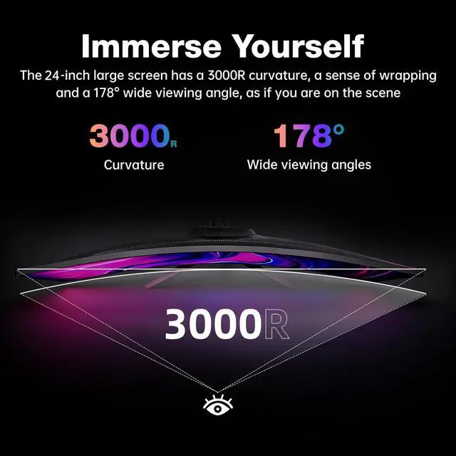 [24-Inch Curved Screen That Wraps Your Vision] See the whole picture with this 24-inch curved computer monitor. Its 3000R screen curve wraps around your vision, pulling you right into the action for a deeply immersive experience whether you're gaming or watching movies.