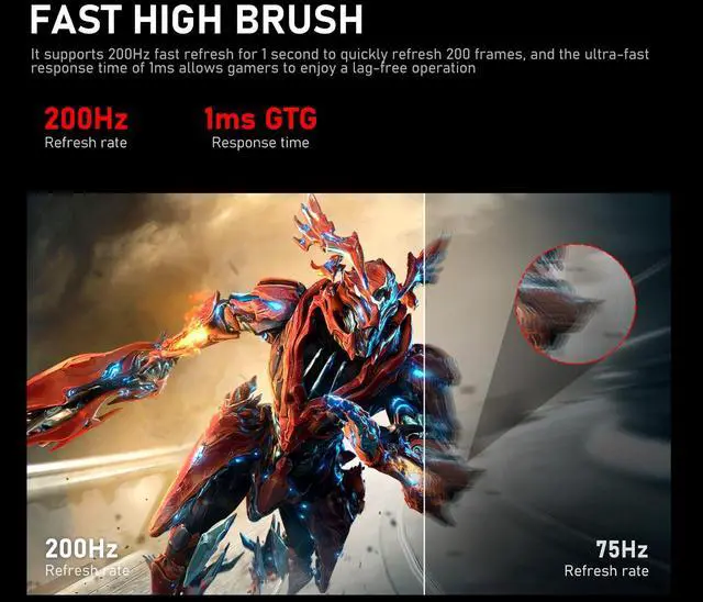 200hz quite fast and fluidGame confrontation depends on the reaction speed of each operation, high refresh rate of 200hz(HD MIup to 120 Hz, DP up to 200 Hz), the image is smooth and delicate, eliminates the feeling of lag, combined with a gtg response speed of 1ms, eliminates streaks generated by high moving images, the game image is fluid and kardon-free, the battlefield is under your control